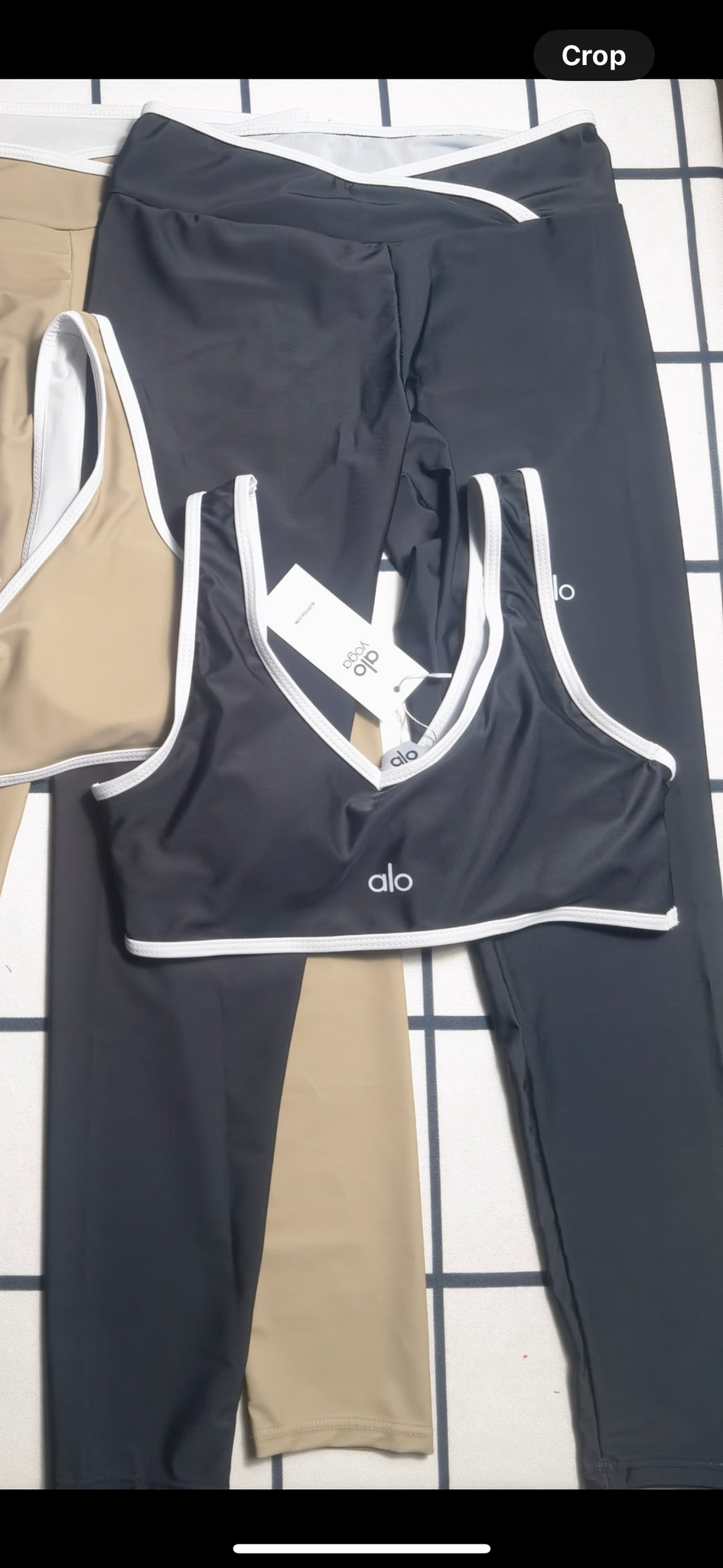 Bra styled top with matching leggings, white trim, spandex
