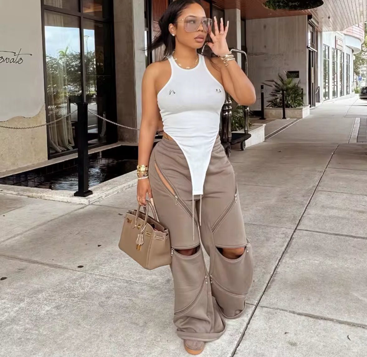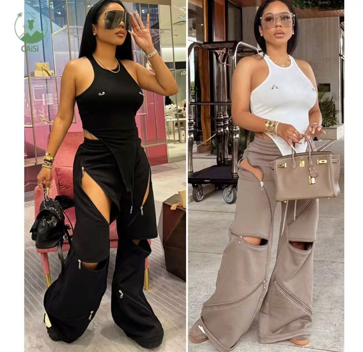 Fashion loose straight leg- flared causal pants with multi zipper pockets